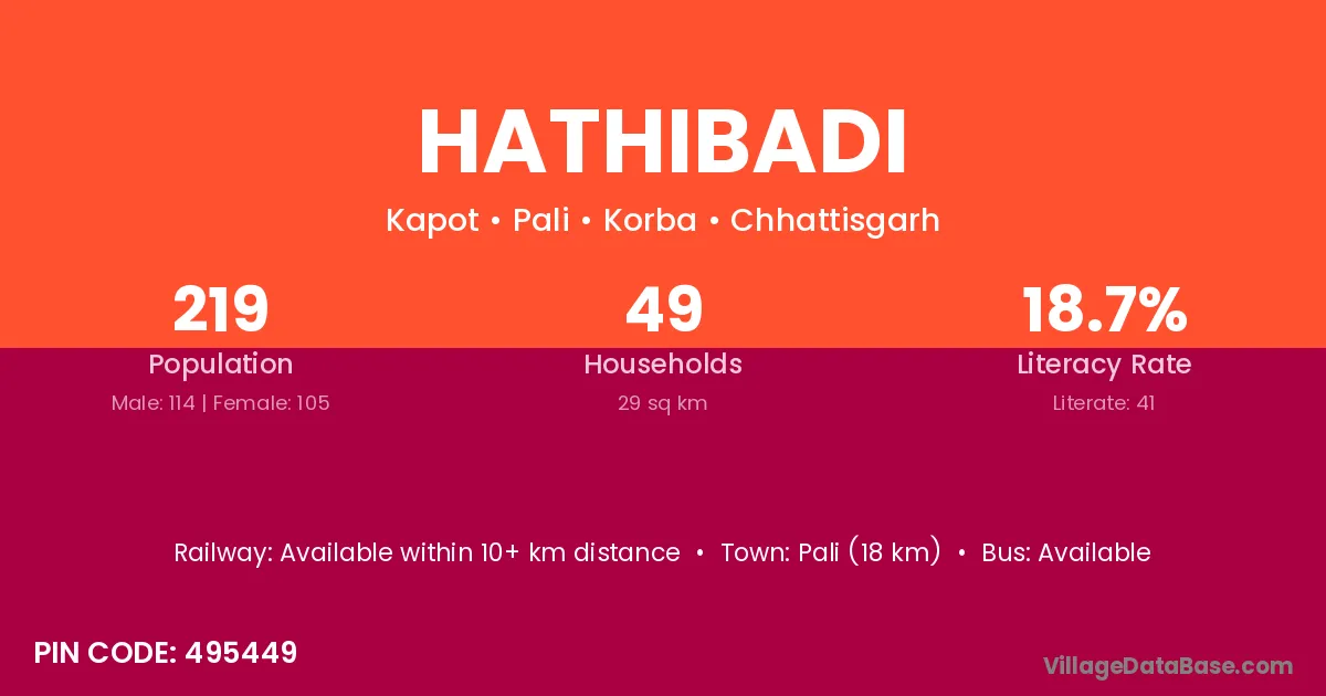 Hathibadi village has a total population of 219 people, of which 114 are males and 105 are females.