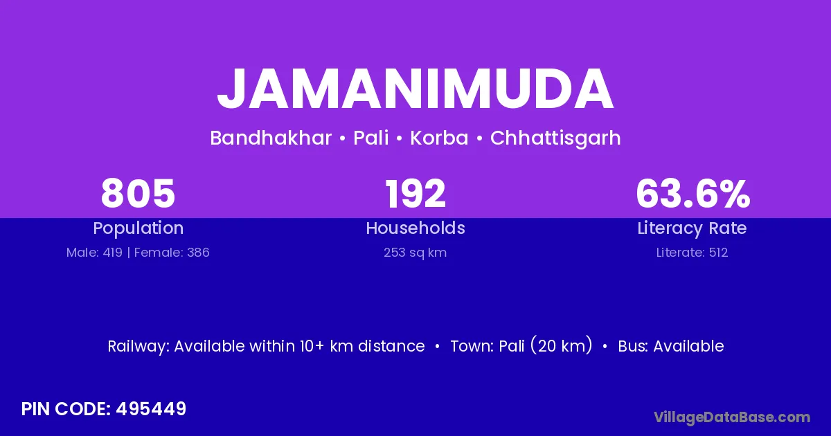 Pali (20 km) is the nearest town to Jamanimuda village for major economic activities and is located approximately 20 km away.