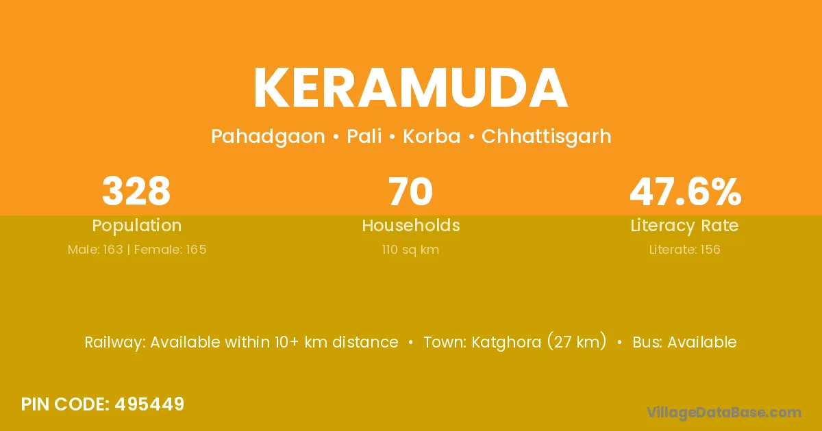 Katghora (27 km) is the nearest town to Keramuda village for major economic activities and is located approximately 27 km away.