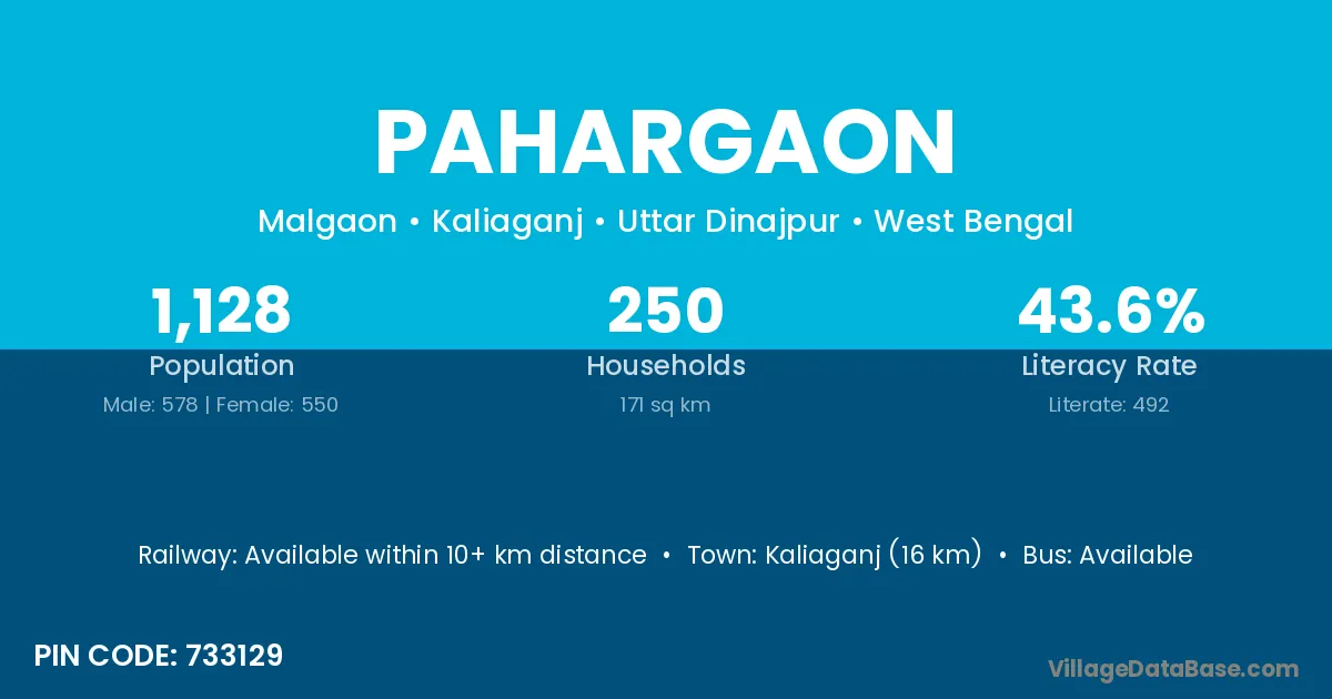 Katghora (30 km) is the nearest town to Pahargaon village for major economic activities and is located approximately 30 km away.
