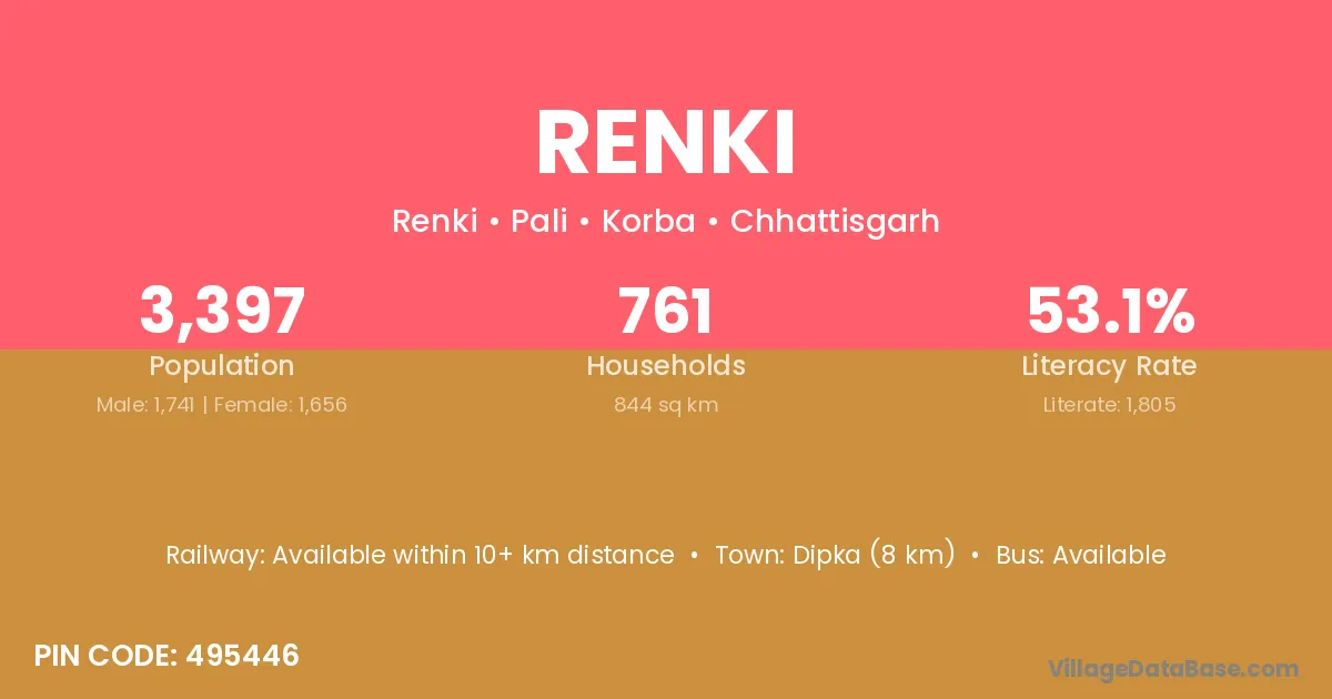 Renki village has a total population of 3,397 people, of which 1,741 are males and 1,656 are females.