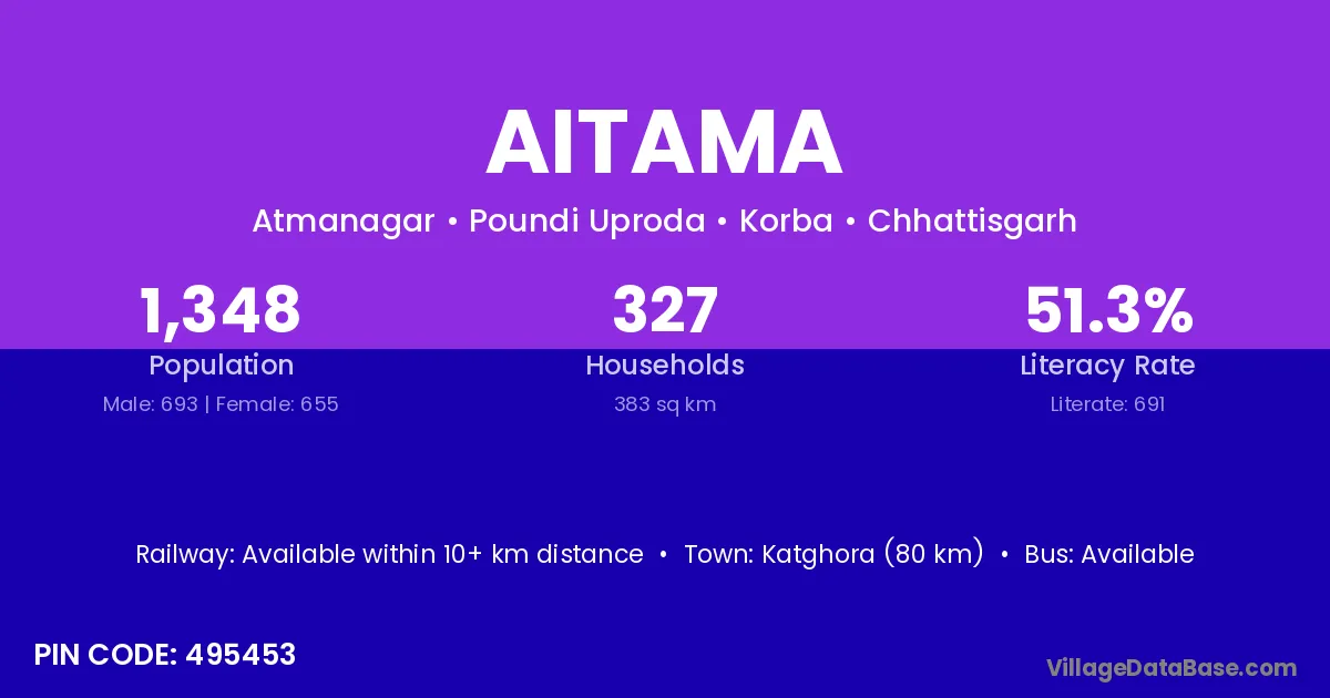 Katghora (80 km) is the nearest town to Aitama village for major economic activities and is located approximately 80 km away.
