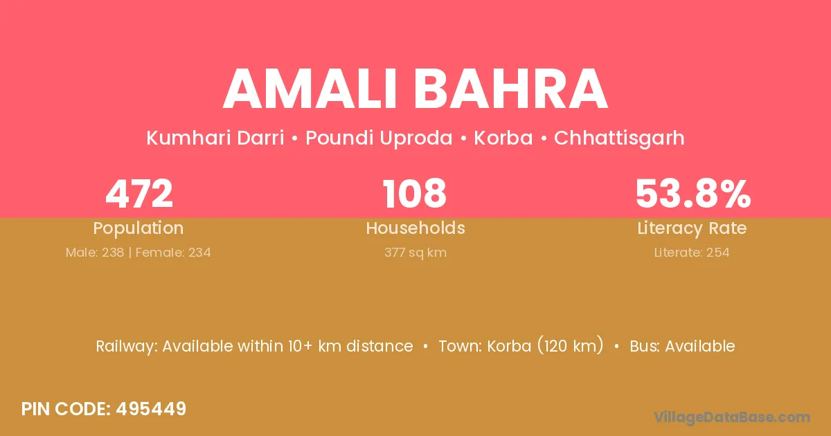 Korba (120 km) is the nearest town to Amali Bahra village for major economic activities and is located approximately 120 km away.