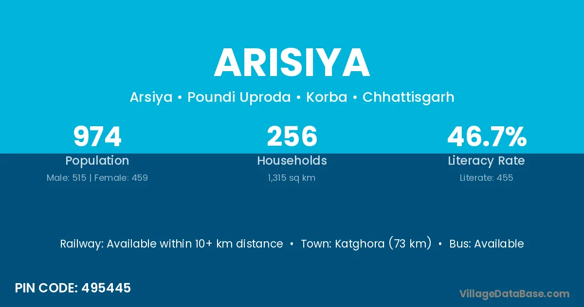 Katghora (73 km) is the nearest town to Arisiya village for major economic activities and is located approximately 73 km away.