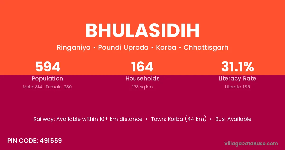 Korba (44 km) is the nearest town to Bhulasidih village for major economic activities and is located approximately 44 km away.