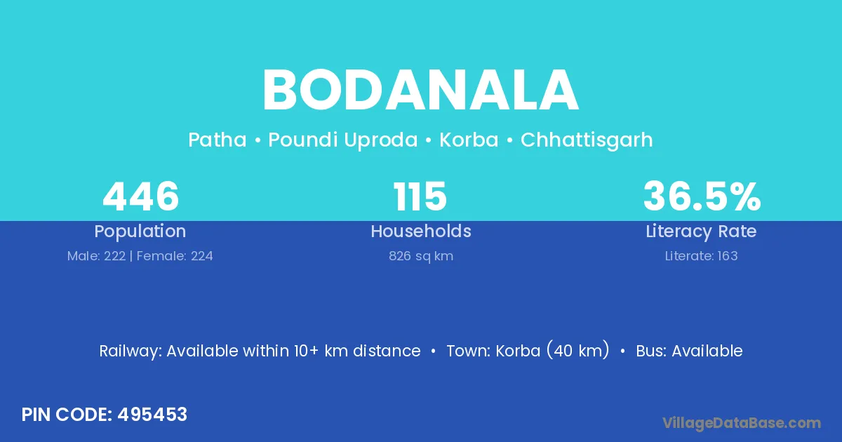 Korba (40 km) is the nearest town to Bodanala village for major economic activities and is located approximately 40 km away.