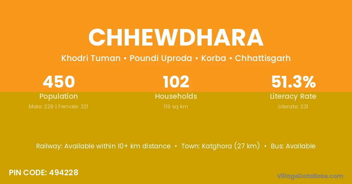 Katghora (27 km) is the nearest town to Chhewdhara village for major economic activities and is located approximately 27 km away.