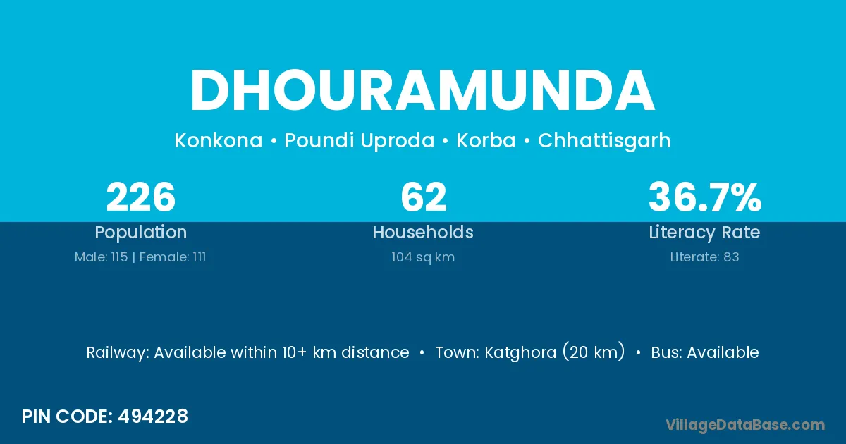 Katghora (20 km) is the nearest town to Dhouramunda village for major economic activities and is located approximately 20 km away.