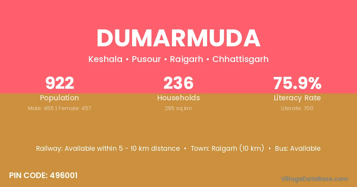 Katghora (25 km) is the nearest town to Dumarmuda village for major economic activities and is located approximately 25 km away.