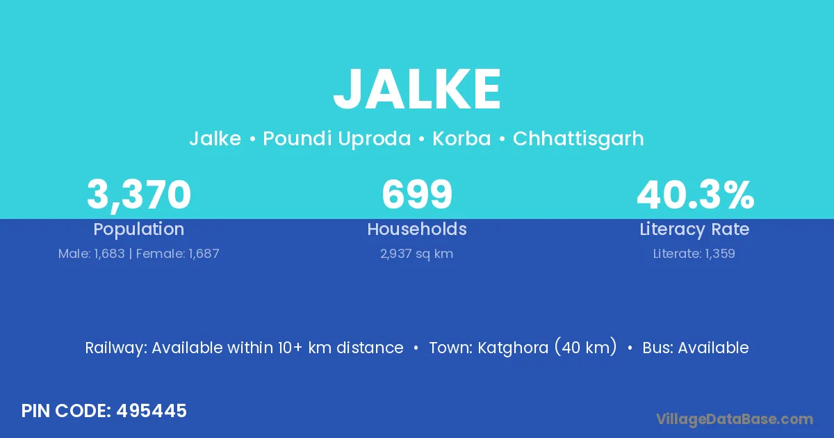 Katghora (40 km) is the nearest town to Jalke village for major economic activities and is located approximately 40 km away.