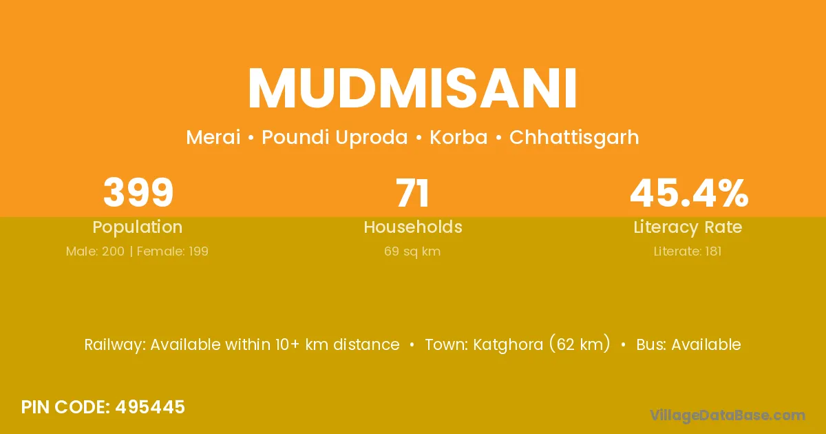 Katghora (62 km) is the nearest town to Mudmisani village for major economic activities and is located approximately 62 km away.