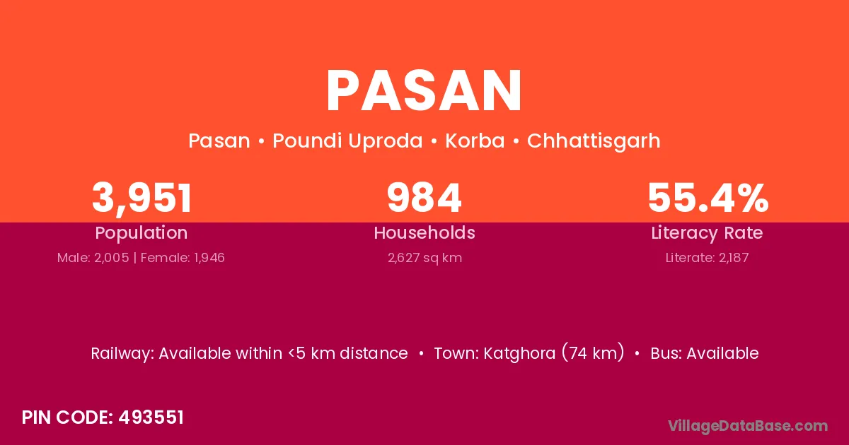 Katghora (74 km) is the nearest town to Pasan village for major economic activities and is located approximately 74 km away.