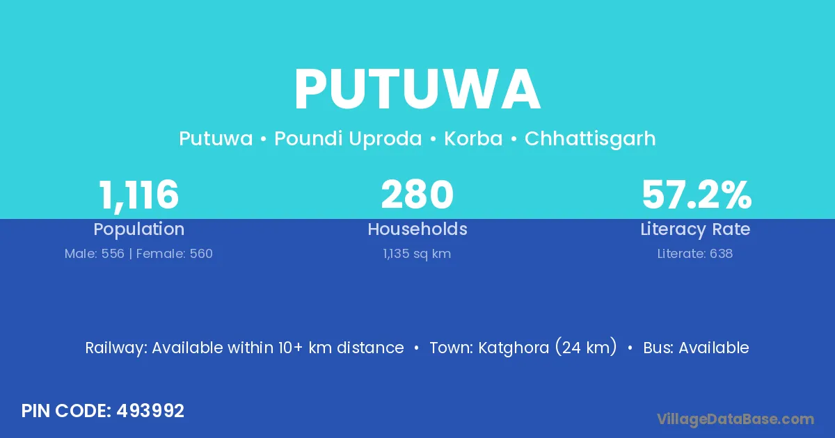Katghora (24 km) is the nearest town to Putuwa village for major economic activities and is located approximately 24 km away.
