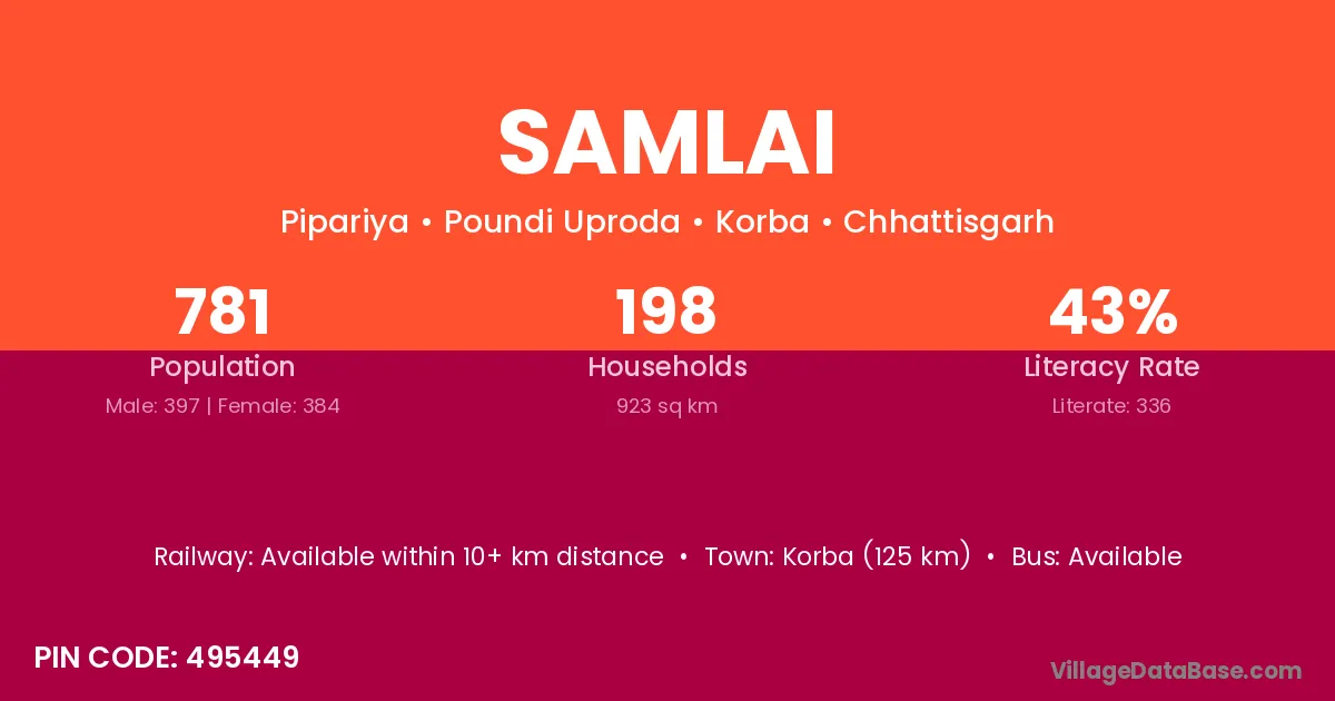 Korba (125 km) is the nearest town to Samlai village for major economic activities and is located approximately 125 km away.