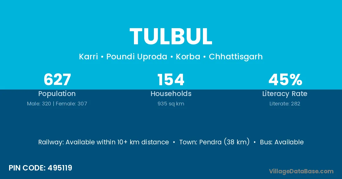 Pendra (38 km) is the nearest town to Tulbul village for major economic activities and is located approximately 38 km away.