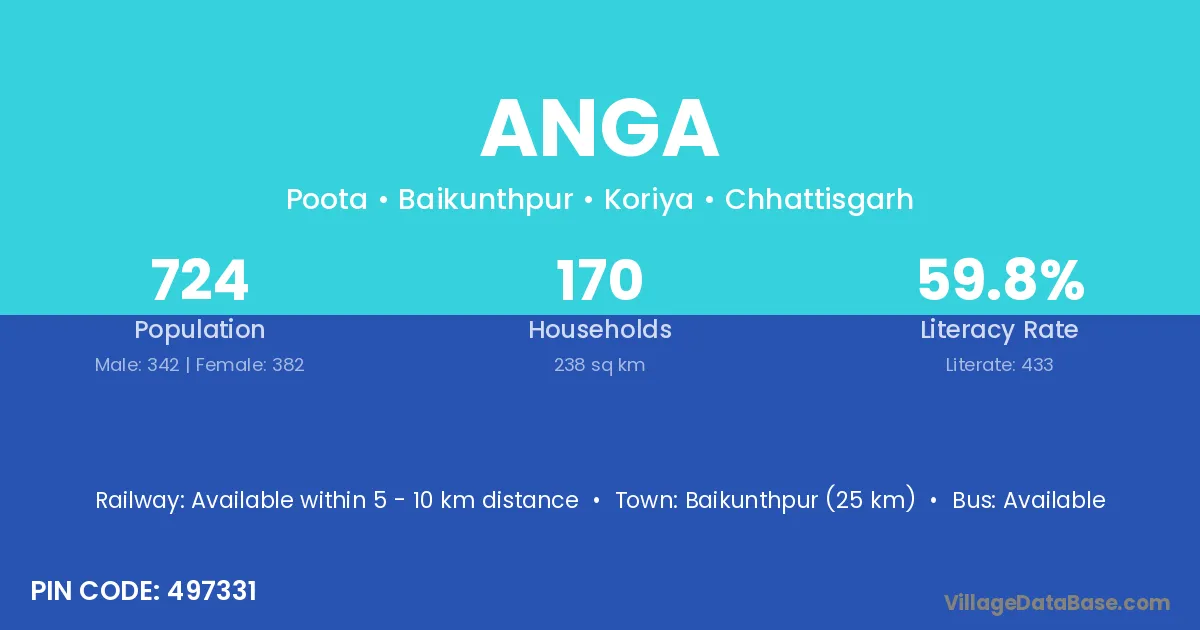 Anga village is located in the Baikunthpur Tehsil of the Koriya district in Chhattisgarh .