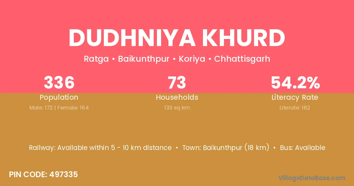 Baikunthpur (18 km) is the nearest town to Dudhniya Khurd village for major economic activities and is located approximately 18 km away.