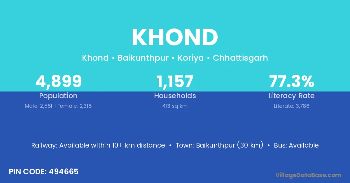 Baikunthpur (30 km) is the nearest town to Khond village for major economic activities and is located approximately 30 km away.