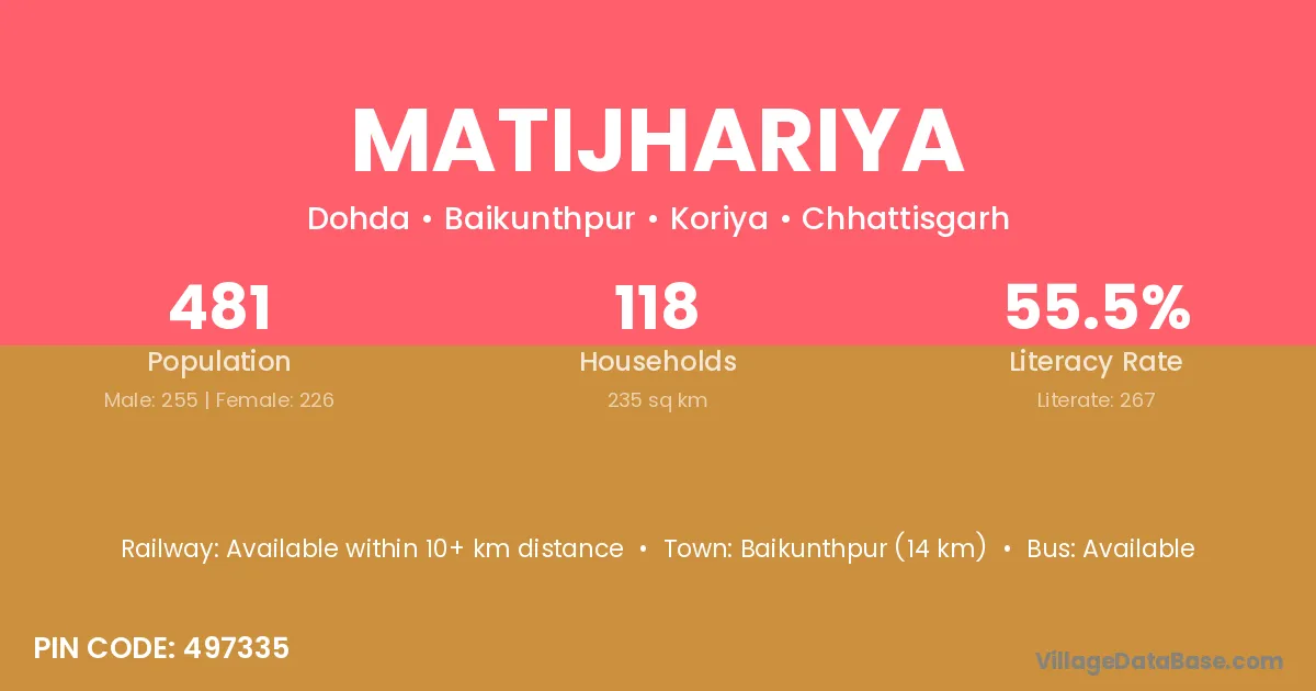 Matijhariya village is located in the Baikunthpur Tehsil of the Koriya district in Chhattisgarh .