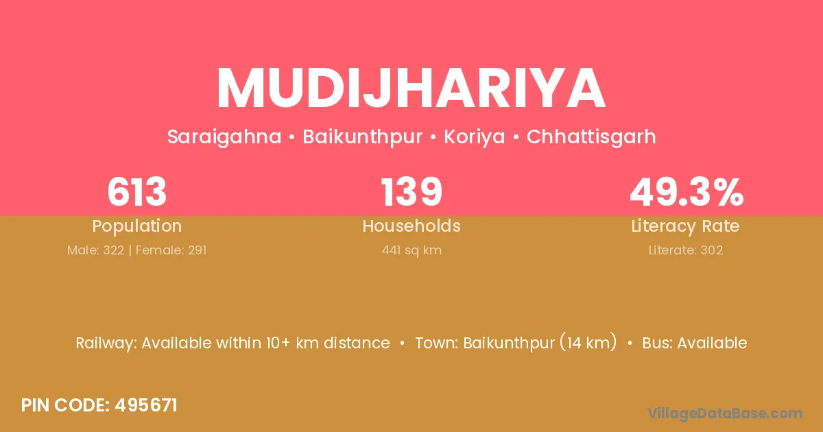 Mudijhariya village is located in the Baikunthpur Tehsil of the Koriya district in Chhattisgarh .