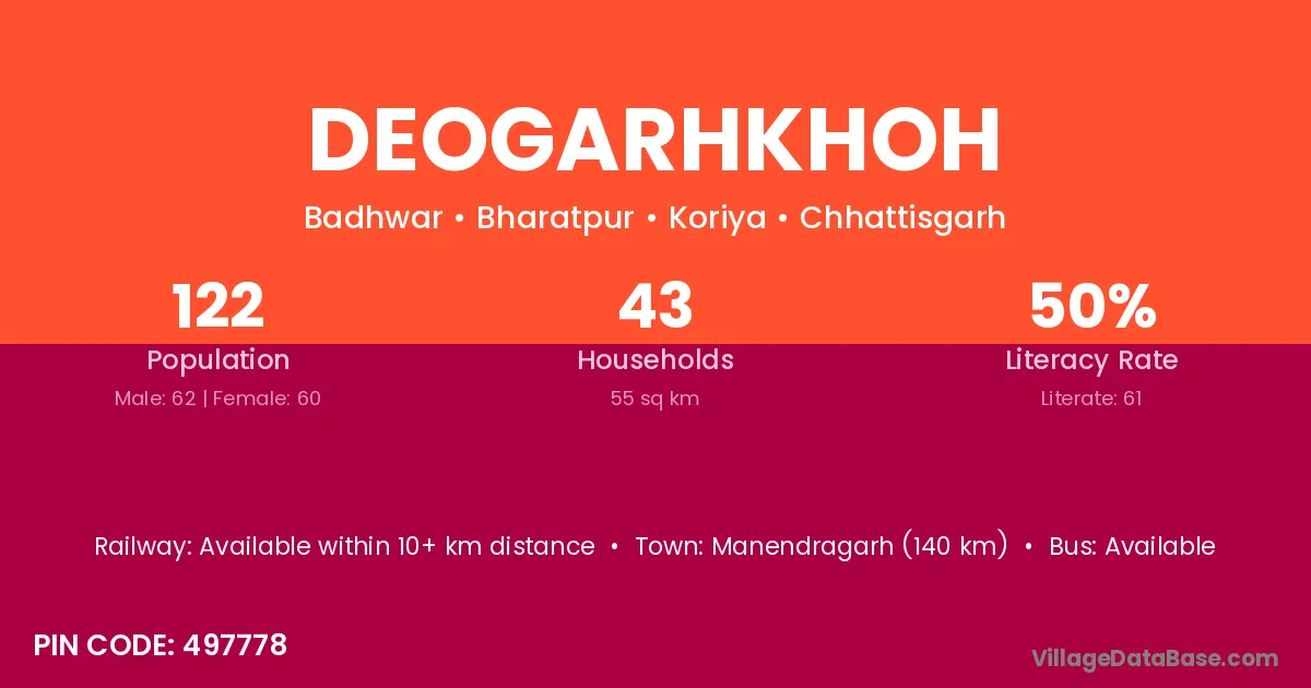 Manendragarh (140 km) is the nearest town to Deogarhkhoh village for major economic activities and is located approximately 140 km away.