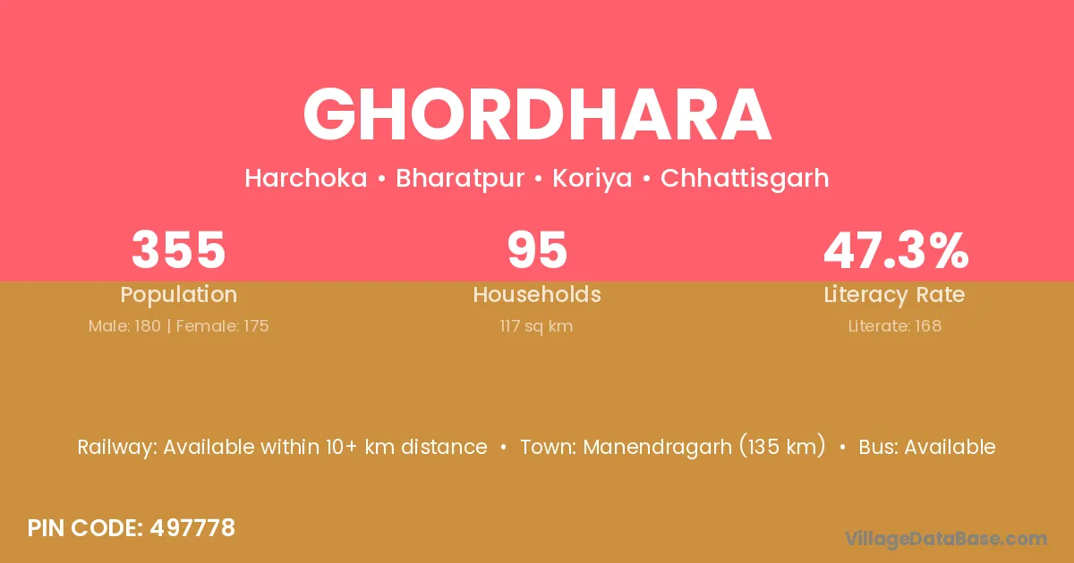 Manendragarh (135 km) is the nearest town to Ghordhara village for major economic activities and is located approximately 135 km away.