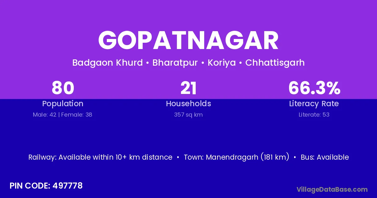 Manendragarh (181 km) is the nearest town to Gopatnagar village for major economic activities and is located approximately 181 km away.