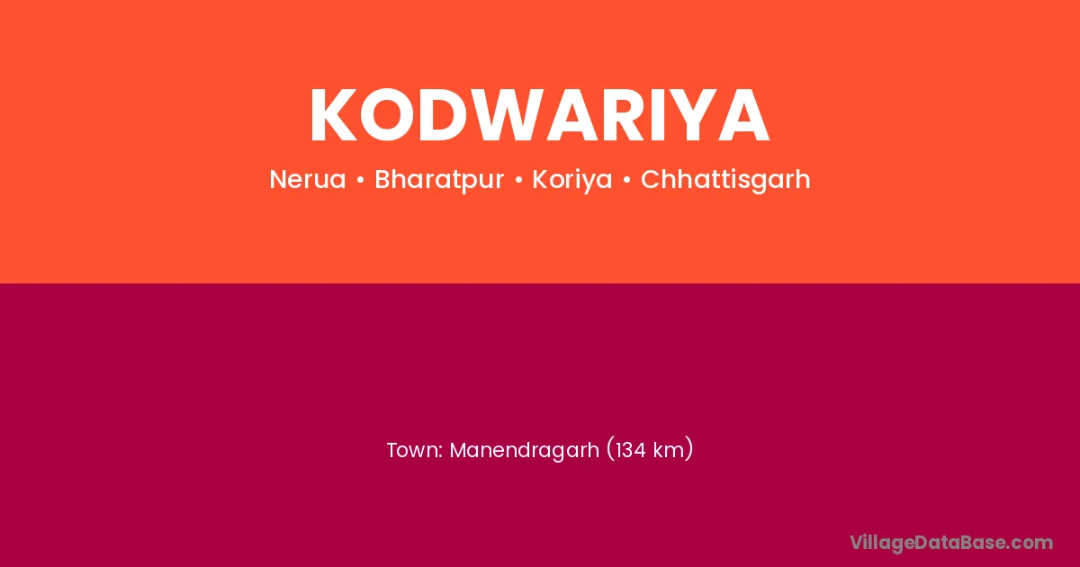 Manendragarh (134 km) is the nearest town to Kodwariya village for major economic activities and is located approximately 134 km away.