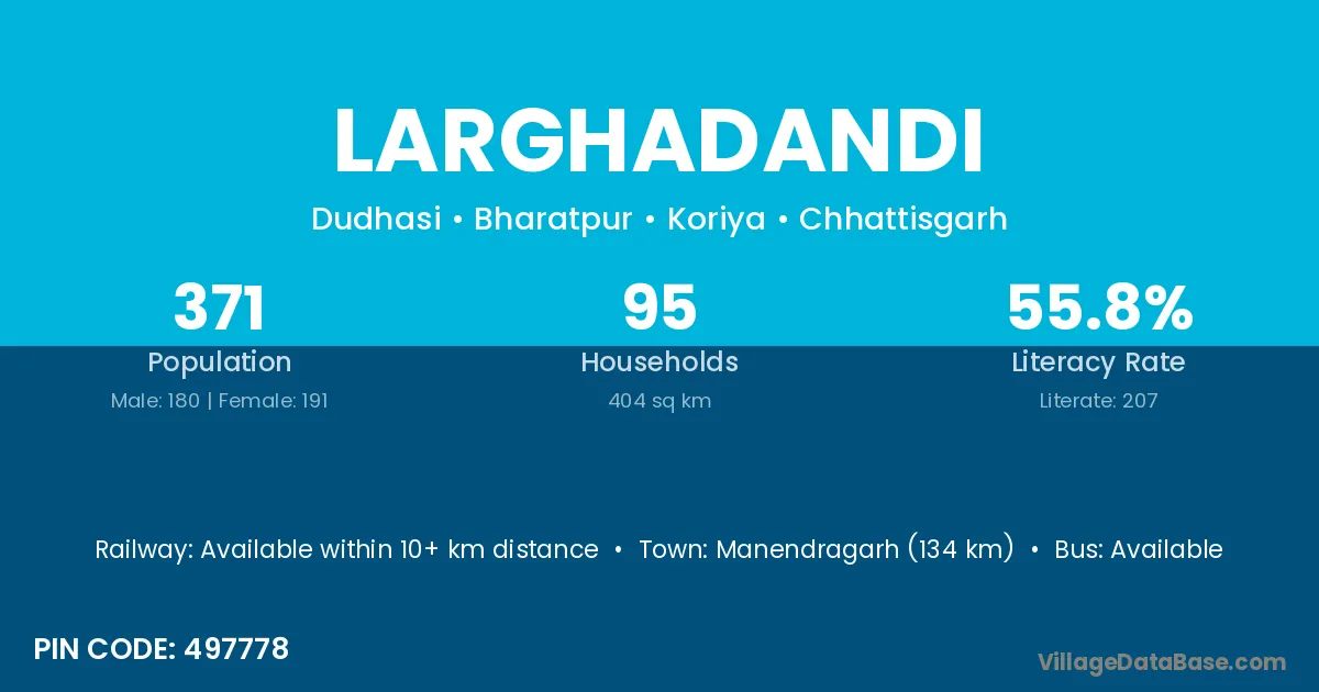 Manendragarh (134 km) is the nearest town to Larghadandi village for major economic activities and is located approximately 134 km away.