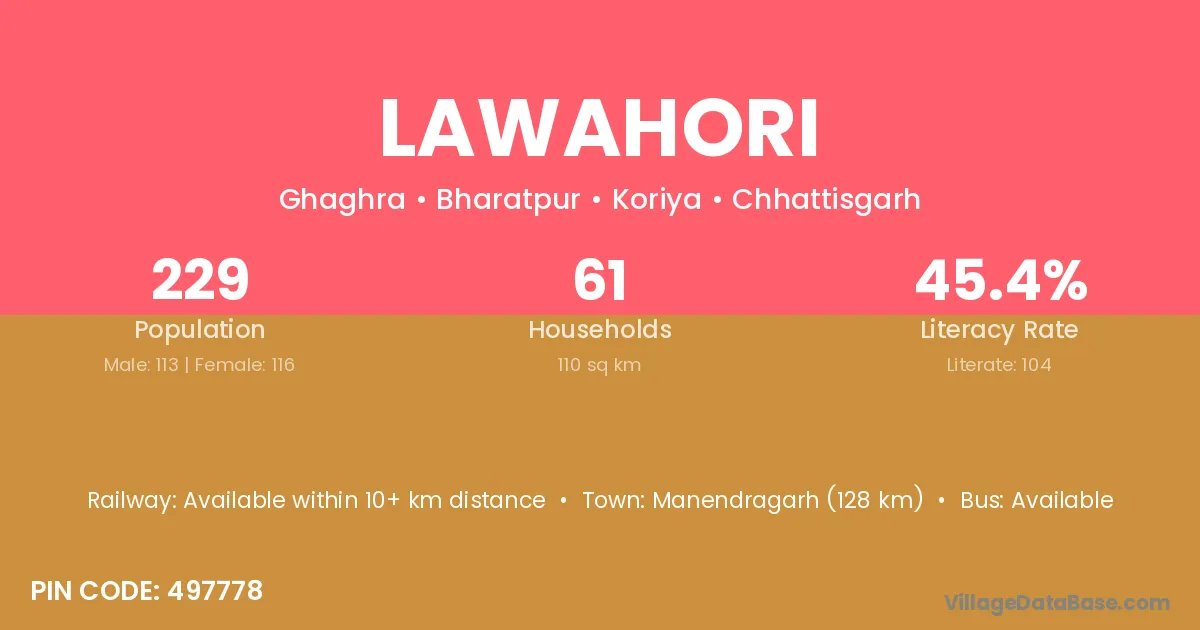 Manendragarh (128 km) is the nearest town to Lawahori village for major economic activities and is located approximately 128 km away.