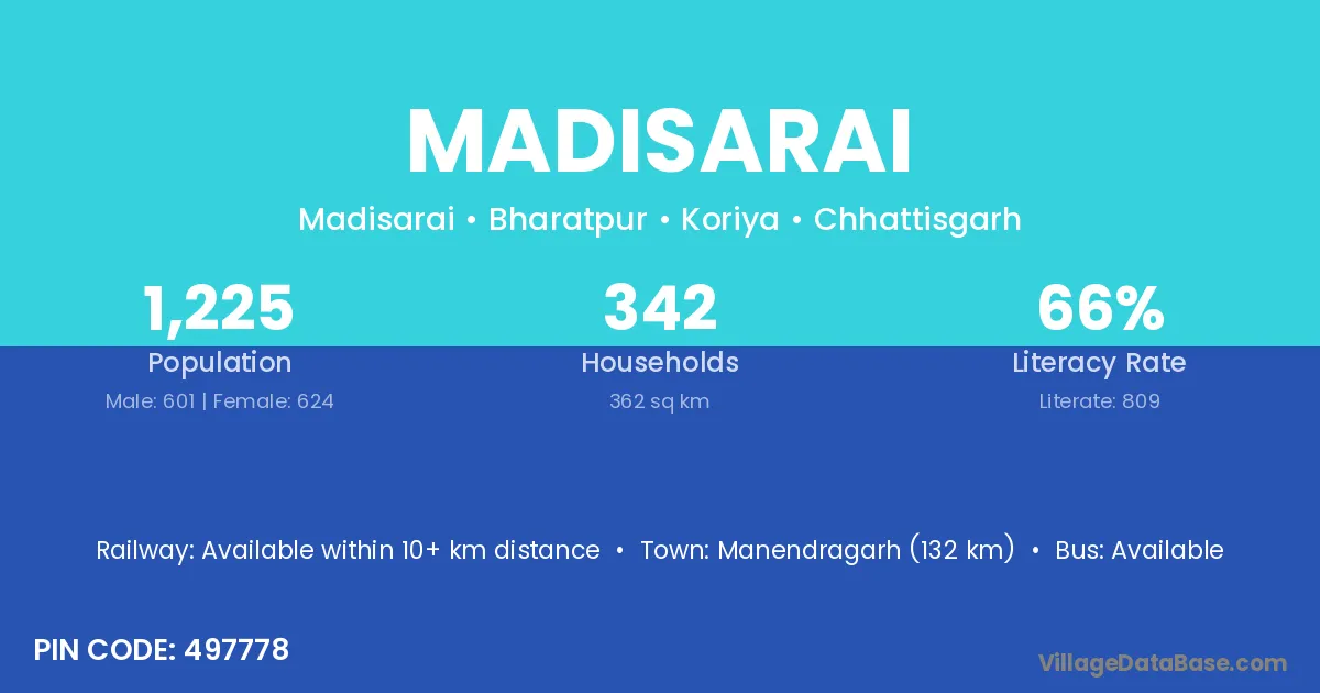 Manendragarh (132 km) is the nearest town to Madisarai village for major economic activities and is located approximately 132 km away.