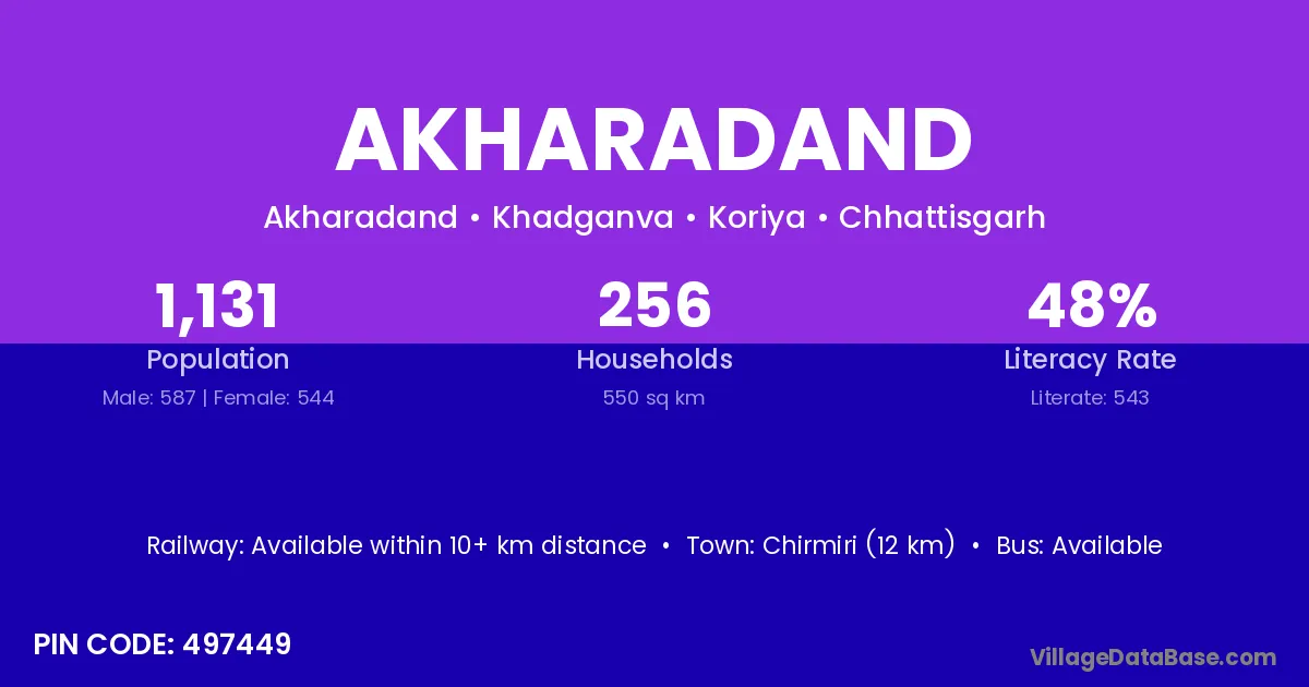 Chirmiri (12 km) is the nearest town to Akharadand village for major economic activities and is located approximately 12 km away.