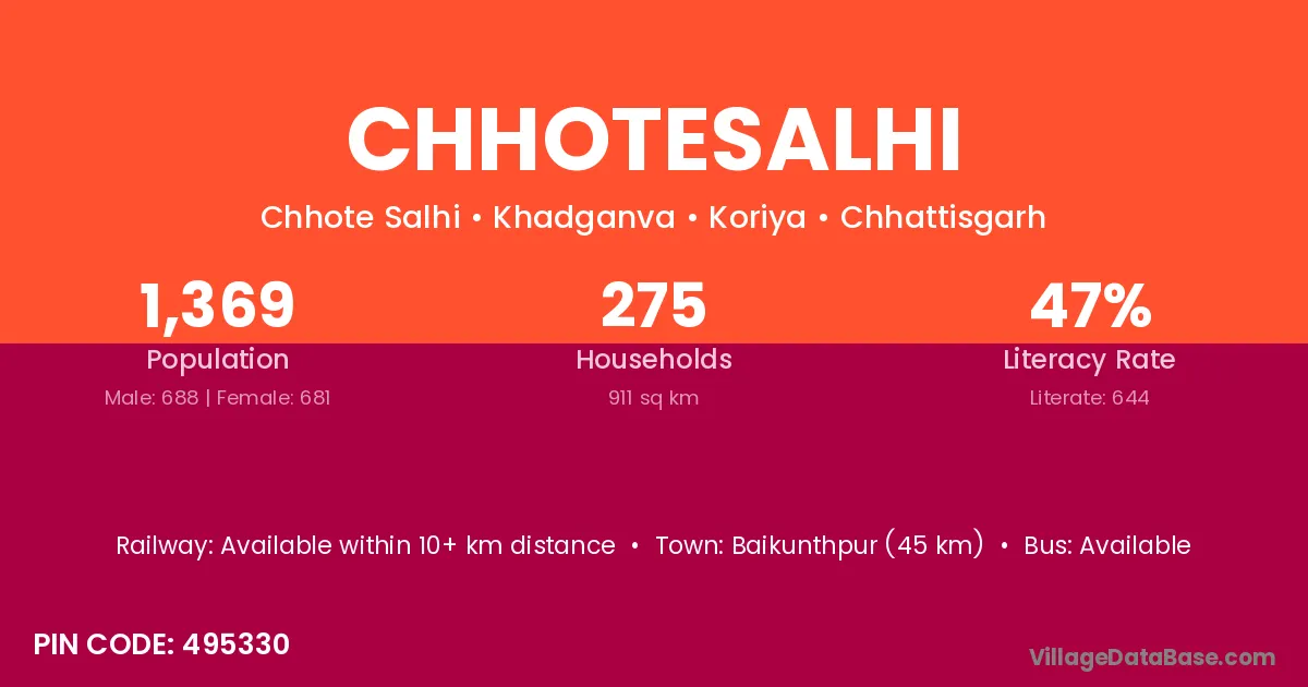 Baikunthpur (45 km) is the nearest town to Chhotesalhi village for major economic activities and is located approximately 45 km away.