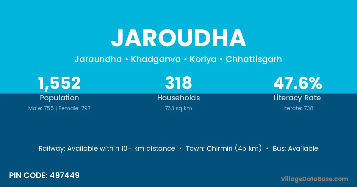 Chirmiri (45 km) is the nearest town to Jaroudha village for major economic activities and is located approximately 45 km away.