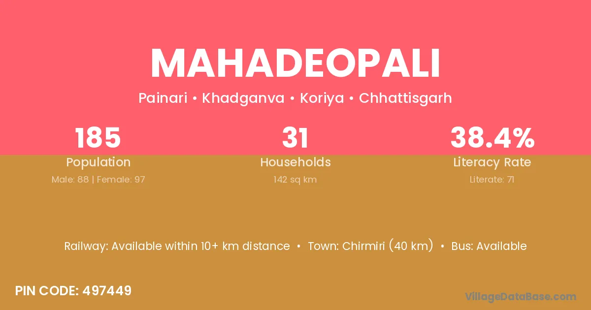 Chirmiri (40 km) is the nearest town to Mahadeopali village for major economic activities and is located approximately 40 km away.