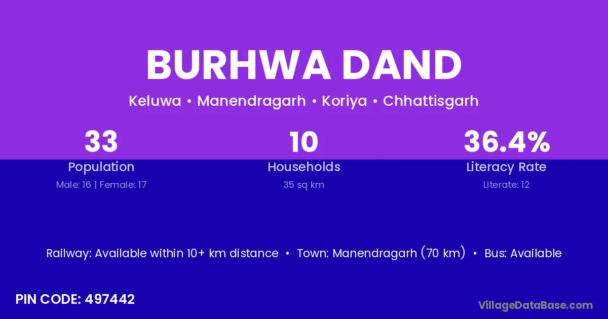 Manendragarh (70 km) is the nearest town to Burhwa Dand village for major economic activities and is located approximately 70 km away.