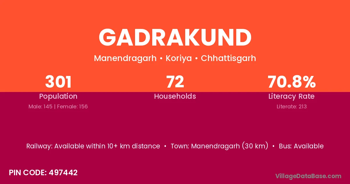 Manendragarh (30 km) is the nearest town to Gadrakund village for major economic activities and is located approximately 30 km away.