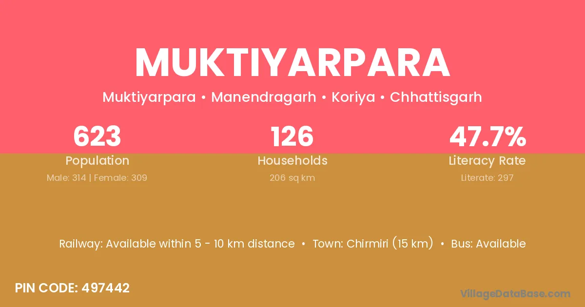 Chirmiri (15 km) is the nearest town to Muktiyarpara village for major economic activities and is located approximately 15 km away.
