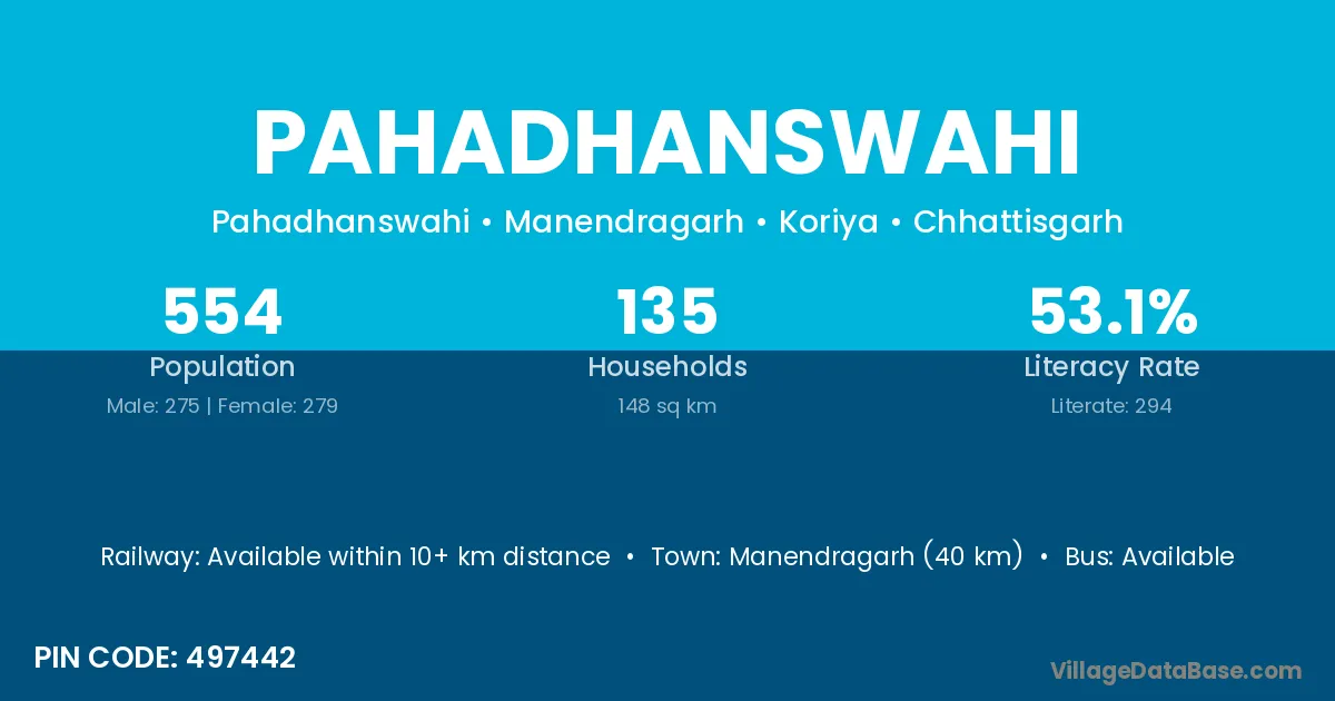 Manendragarh (40 km) is the nearest town to Pahadhanswahi village for major economic activities and is located approximately 40 km away.