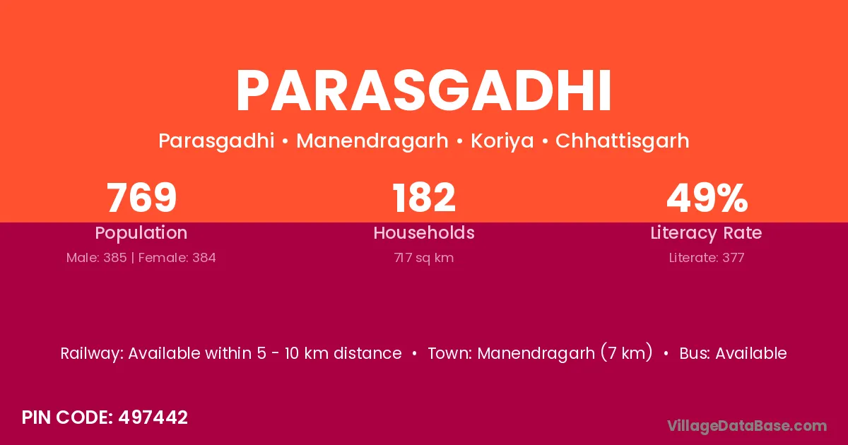 Manendragarh (7 km) is the nearest town to Parasgadhi village for major economic activities and is located approximately 7 km away.