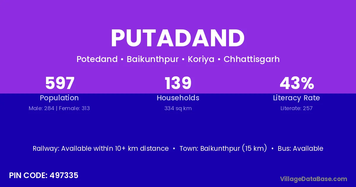 Manendragarh (25 km) is the nearest town to Putadand village for major economic activities and is located approximately 25 km away.