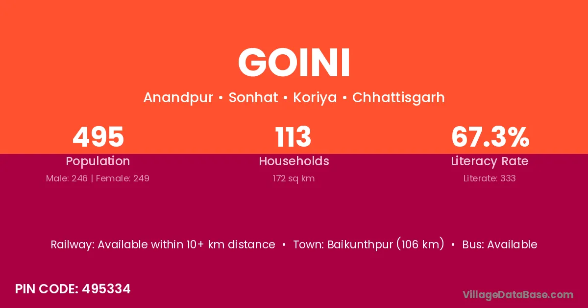 Baikunthpur (106 km) is the nearest town to Goini village for major economic activities and is located approximately 106 km away.