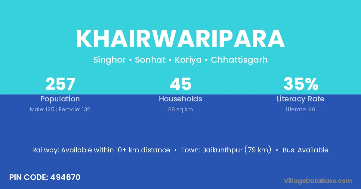 Khairwaripara village has a total population of 257 people, of which 125 are males and 132 are females.