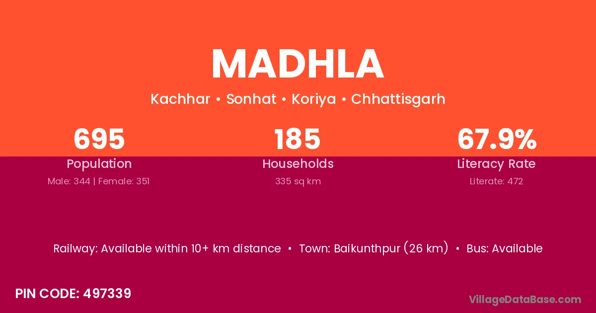 Baikunthpur (26 km) is the nearest town to Madhla village for major economic activities and is located approximately 26 km away.