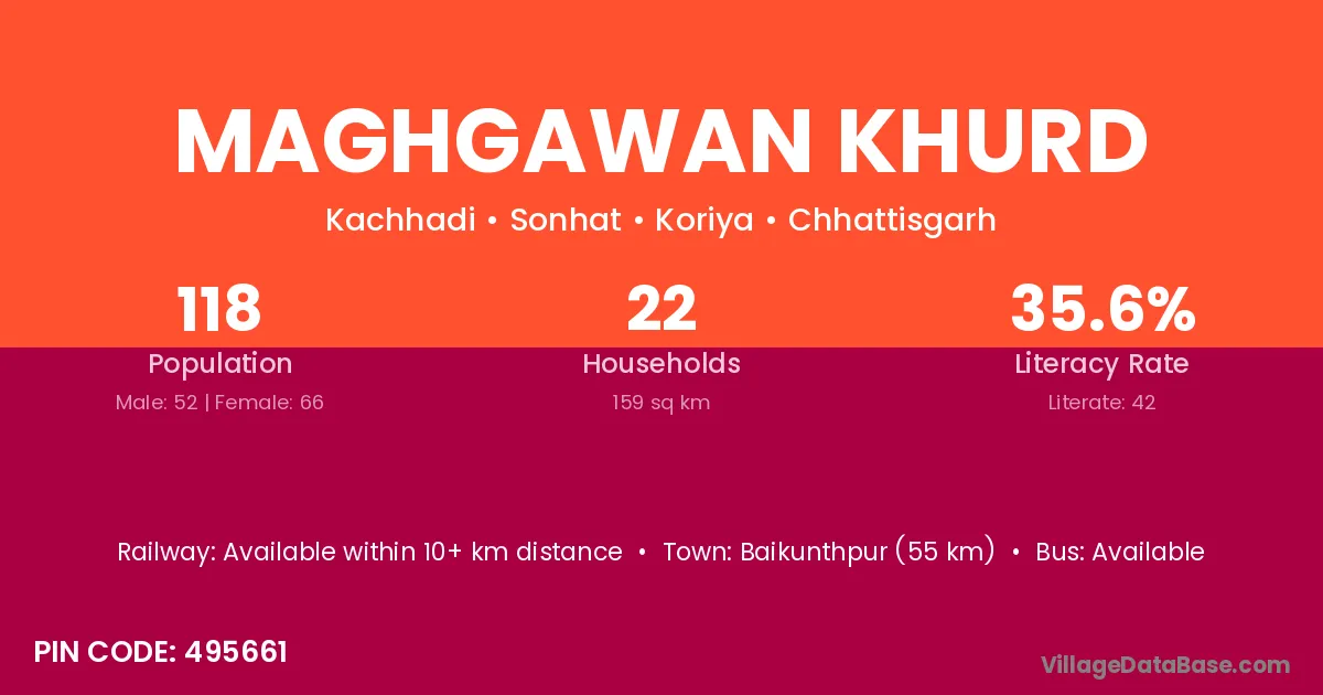 Maghgawan Khurd village has a total population of 118 people, of which 52 are males and 66 are females.