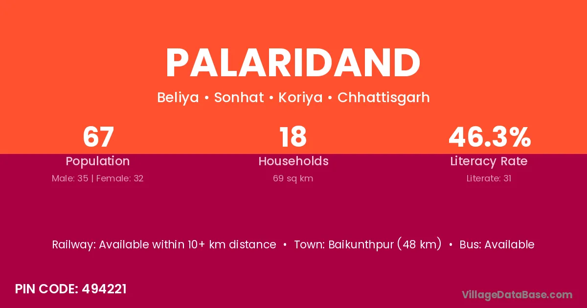 Baikunthpur (48 km) is the nearest town to Palaridand village for major economic activities and is located approximately 48 km away.