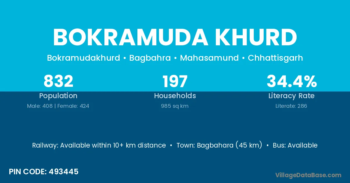 Bagbahara (45 km) is the nearest town to Bokramuda Khurd village for major economic activities and is located approximately 45 km away.