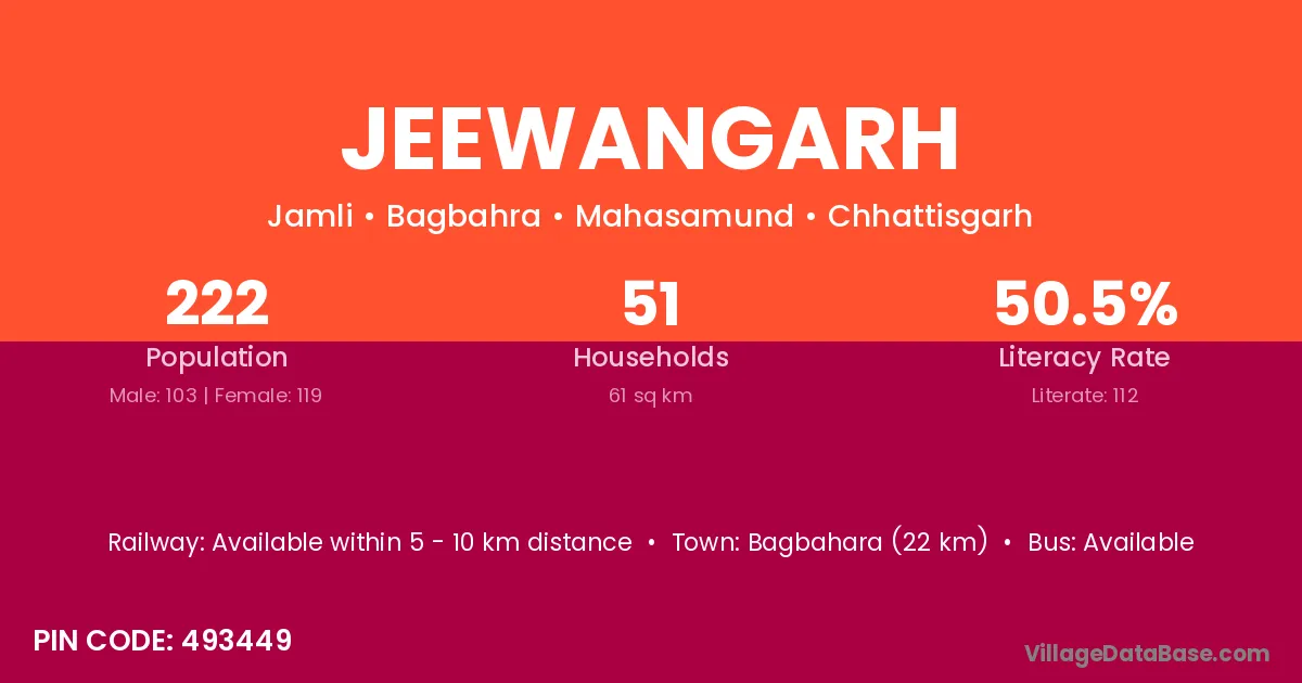 Jeewangarh village has a total population of 222 people, of which 103 are males and 119 are females.