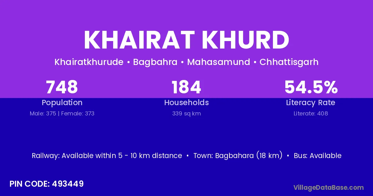 Bagbahara (18 km) is the nearest town to Khairat Khurd village for major economic activities and is located approximately 18 km away.
