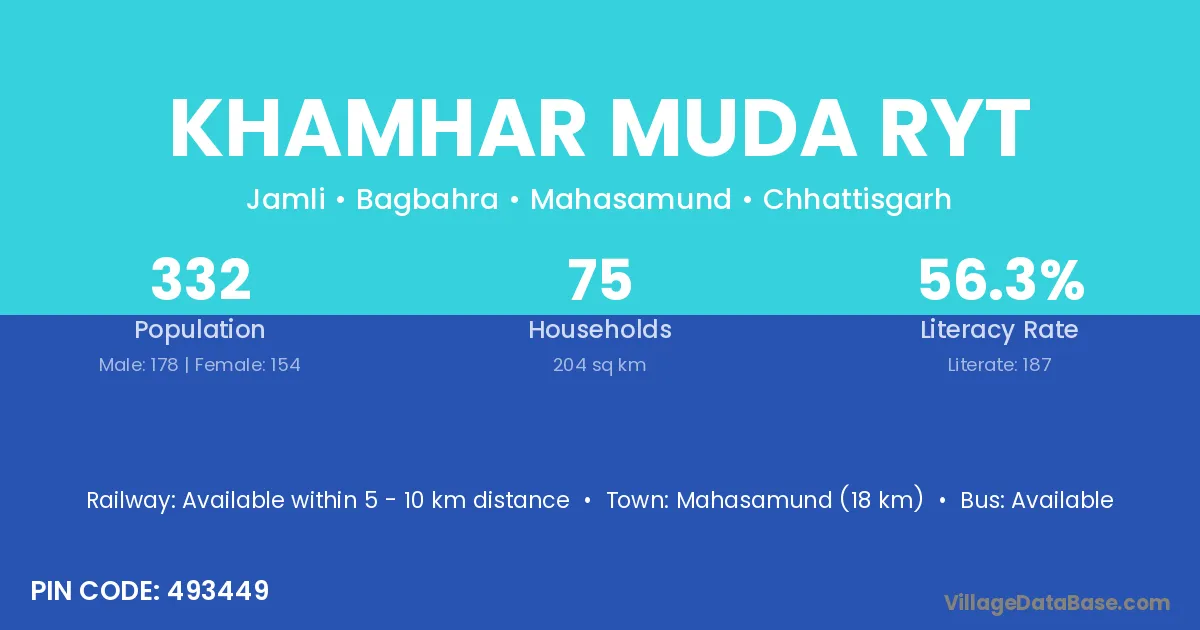 Khamhar Muda Ryt village has a total population of 332 people, of which 178 are males and 154 are females.